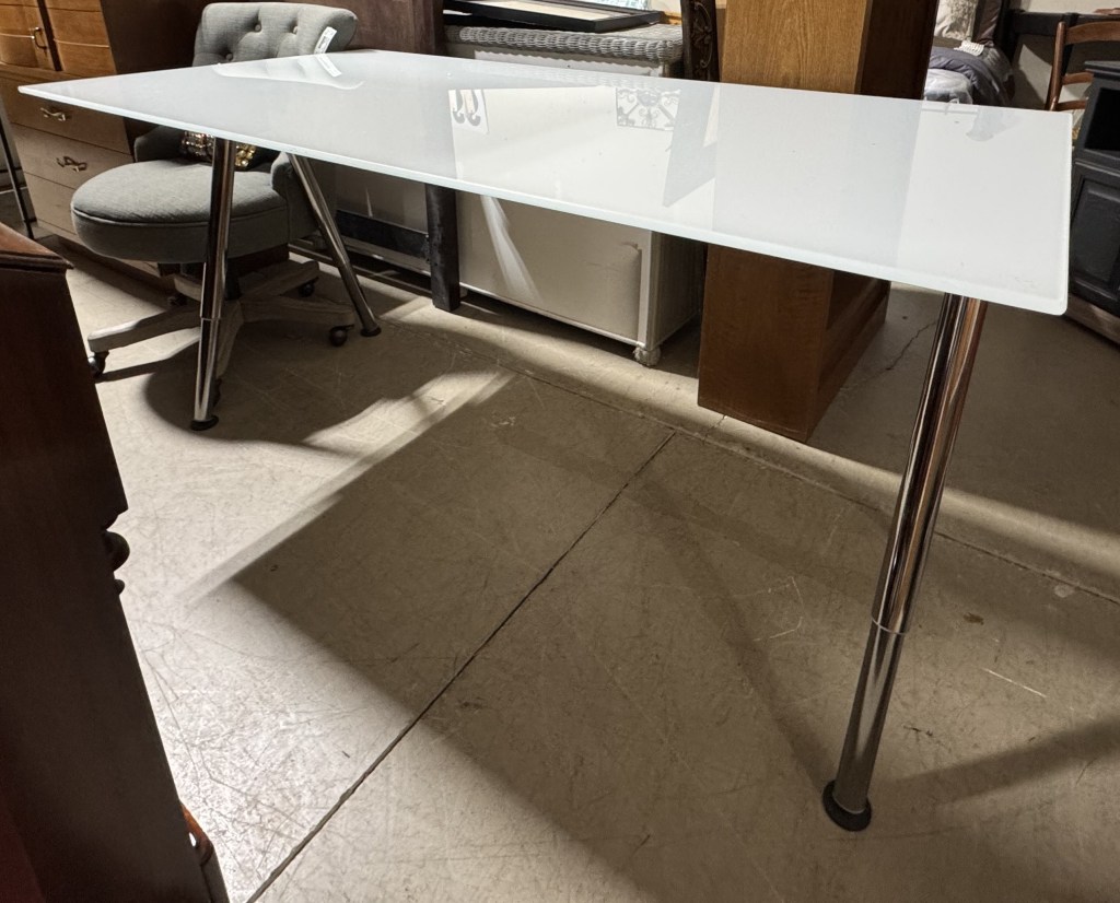 November 3, 2025January 27, 2026 New Leaf Home Furnishings White Glass Table Desk with Chrome Legs 65853 – $74.50 63″w x 31.5″d x 31″h Share with Friends and Family: Email a link to a friend (Opens in new window) Email Like Loading... Related