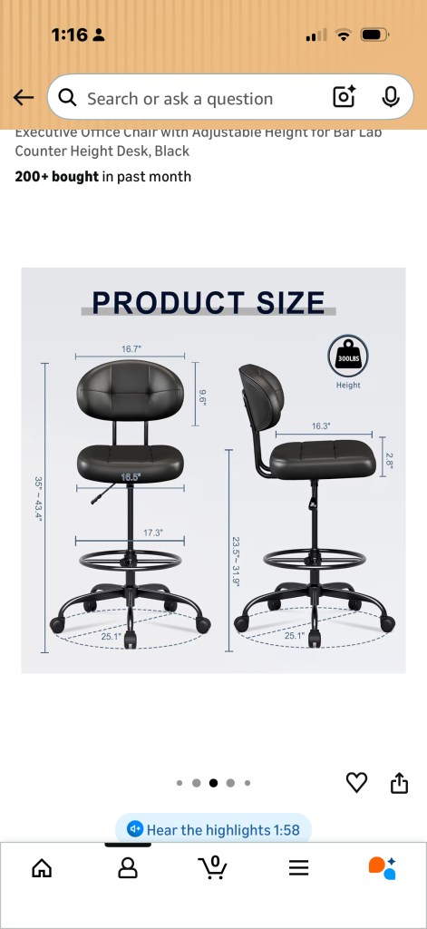Chair height: 35 to 43.4 inches. Cushion height: 23.5 to 31.9 inches from the floor. Cushion front and back distance: 16.3 inches. Cushion width: 16.5 inches.